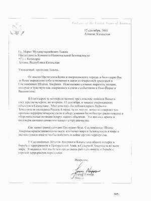 Я благодарен за непосредственное предложение помощи Вашего государства вечером, во вторник, 11 сентября, в защите американских объектов в Казахстане. Мне хотелось бы поблагодарить Первого-Заместителя господина Рахата Алиева, за то, что он лично подтвердил что пиротиво-террористические силы и оборудования были быстро расположены в оборонительные позиции вокруг наших объектов. Это явилось ярким и подтверждающим символом нашего сотрудничества.