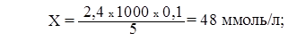 де: 1,8 – ІІ позначка, 2,4 – ІІІ позначка, (1,8 +2,4/ 2) – середнє арифметичне значення, 1000 – перерахунок на 1 літр, 0,1 – кількість мг екв лугу в 1 мл 0,1 н розчину, 5 – кількість шлункового соку, яка взята для титрування (мл).