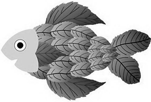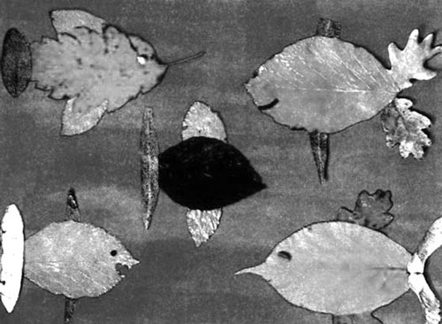 Инструменты и материалы: средние и мелкие листья дуба, ясеня, тополя, ивы, крылатки ясеня, альбомный лист, гуашь, клей. Закрасьте синей краской лист бумаги. Можно подрисовать внизу камушки или водоросли. Когда бумага высохнет, выложите из высушенных листьев рыбок и осторожно приклейте. Глаза можно сделать из маленьких зернышек или же просто нарисовать их фломастером (рис. 8). Обратите также внимание на то, какие листья и плоды лучше всего подойдут для плавников.