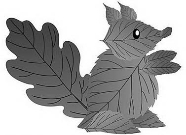 Инструменты и материалы: плотный лист бумаги, один крупный дубовый, четыре небольших рябиновых и несколько разных по размеру березовых листьев, ягода черноплодной рябины, ножницы и клей. Разложите листья в необходимой последовательности на листе бумаги и посмотрите, что получится. Скорректируйте получившийся рисунок, подберите листья нужного размера. Выберите самый крупный березовый лист, он станет тельцем белочки. Нанесите немного клея на его середину и прикрепите в центре бумажного листа. Постарайтесь не приклеить края, так как под них нужно будет подложить еще листья для хвоста и лапок зверька. Для хвоста выберите дубовый лист. Приклейте его под острым углом к березовому листу. Черешок дубового листа спрячьте под тельцем белки. Сделайте лапки. Для верхних лапок возьмите два рябиновых листочка. Для нижних лапок средний по размеру березовый лист разрежьте на две половинки по главной жилке. Сначала приклейте задние лапки, которые нужно подложить под березовый лист – тельце белки. Затем приклейте край березового листа и поверх него приклейте передние лапки. Для головы бельчонка возьмите небольшой березовый листок и приклейте его поверх тельца. Из оставшихся рябиновых листьев вырежьте ушки и носик для белочки. Сначала приклейте дальнее ушко, часть его спрячьте за голову белочки. Затем, отступив чуть в сторону, уже поверх головы, приклейте ближнее ухо. Приклейте носик и глаз из черноплодной рябины (рис. 9).