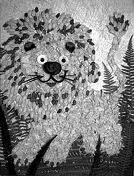 Забавный сказочный львенок выглядит совсем, как в мультфильме, хотя его пушистая грива – это косточки от дыни и арбуза, а лохматая шерстка – простые опилки! Инструменты и материалы: лист белой бумаги, светло‑оранжевый сизофлор формата А4, опилки, косточки от арбуза, дыни, листья папоротника, две чешуйки от сосновой шишки, один каштан, пластмассовые глазки, черная и красная бархатная бумага, ножницы, клей ПВА. Светло‑оранжевый сизофлор закрепите клеем на белой бумаге. От зеленого и темно‑коричневого листиков папоротника отрежьте несколько маленьких листочков, разложите их в нижней части фона, закрепите клеем. Чтобы выполнить фигуру львенка, воспользуйтесь трафаретами туловища с лапками, мордочки, гривы и хвоста. Вырежьте детали из картона и последовательно их оформите. Силуэт туловища с лапками аккуратно смажьте клеем, заполните опилками. Так же оформите мордочку (кружок). Для деталей мордочки используйте две чешуйки сосновой шишки – это будут ушки; пластмассовые бусинки – глазки; каштан – носик; «подушечки», усики и ротик вырежьте из бархатной бумаги. Волнистый контур гривы аккуратно заполните клеем, закрепите на нем косточки арбуза и дыни. Хвост – опилки; кисточка – косточки дыни и арбуза. Подготовленные детали разложите на основном фоне, закрепите клеем. Ваш львенок готов (рис. 12). Теперь осталось оформить его в рамку и повесить в детской комнате!