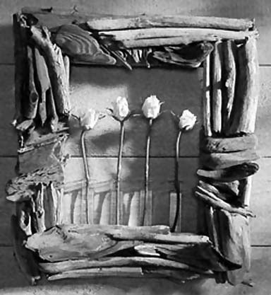 Инструменты и материалы: старая рама для картины с шириной планки 7‑10 см, необработанные ветки и куски древесины длиной по 5‑10 см, 4 стеклянные пробирки, 5 пробок, термоклей. Ветки и куски древесины расположите на старой раме в любом порядке и приклейте термоклеем. На заднюю сторону рамы наклейте в ряд пробки с интервалами для пробирок. Пробирки укрепите между пробками, налейте в них воду и вставьте живые цветы (рис. 29).