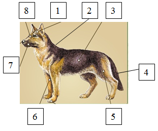 Б) Зверніть увагу на голову собаки, які органи є на голові ссавців, яких немає у представників інших класів тварин? 2. Розгляньте зображені на малюнку особливості зовнішньої будови ссавця й укажіть відділи тіла тварини, позначені цифрами 1-8.