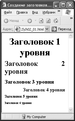 <html> <head> <title>Создание заголовков</title> </head> <body> <h1 align="center">Заголовок 1 уровня</h1> <h2 align="justify">Заголовок 2 уровня</h2> <h3 align="left">Заголовок 3 уровня</h3> <h4 align="right">Заголовок 4 уровня</h4> <h5>Заголовок 5 уровня</h5> <h6 title="Заголовок 6 уровня">Заголовок 6 уровня</h6> </body> </html>