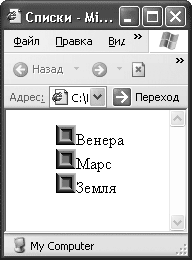 <html> <head> <title>Списки</title> <body> <ul> <img src="marker.jpg" />Венера<br /> <img src="marker.jpg" />Марс<br /> <img src="marker.jpg" />Земля<br /> </ul> </body> </html>