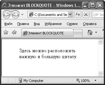 <html xmlns="http://www.w3.org/1999/xhtml"> <head> <meta http‑equiv="Content‑Type" content="text/html; charset=windows‑1251" /> <title>Элемент BLOCKQUOTE</title> <body> <blockquote> Здесь можно расположить важную и большую цитату. </blockquote> </body> </html>