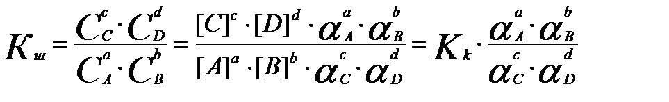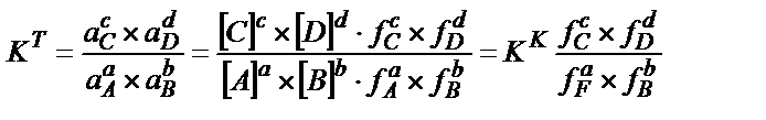Жалпы алғандааА +вВ ↔ сС + dD реакциясы үш константамен сипатталады. Термодинамикалық не шындық тепе-теңдік константасы Кт ерітндінің иондық күшіне және бөгде реакциялардың жүруіне байланысты емес: