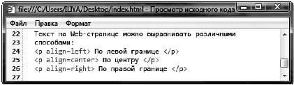 center — выравнивает текст по центру; justify — выравнивает текст по ширине. Примером может служить тег: <p align=center> По центру </p> Пример исходного кода для выравнивания текста представлен на рис. 3.13, а результат его интерпретации браузером — на рис. 3.14.