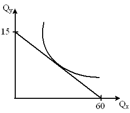 Решение Закон убывающей отдачи гласит, что если к фиксированным по размеру факторам добавлять дополнительные единицы переменного фактора, то настанет момент, когда получаемый в результате добавочный продукт начнет неуклонно снижаться. Убывающая отдача наблюдается только в краткосрочном периоде, ибо в долгосрочном все факторы становятся переменными и объемы их могут быть изменены. Экономическая теория (политэкономия): Учебник / под общ. ред. заслуженных деятелей науки Российской Федерации, профессоров В.И. Видяпина, Г.П. Журавлевой. – М.: Изд-во Рос.экон.акад., 2000. – С.211–212. Задание 14.4. На рисунке показана кривая безразличия и бюджетная линия некоего потребителя.