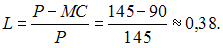 где P – цена единицы продукции, MC – предельные издержки. Он изменяется от нуля для совершенной конкуренции до единицы для монополии. В данном задании оптимальный объем производства равен 25, монопольная цена – 145, предельные издержки составляют 90.