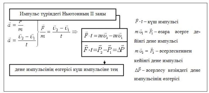 Дене импульсі мен күш импульсі арасындағы байланысты Ньютоның екінші заңы арқылы өрнектейміз.