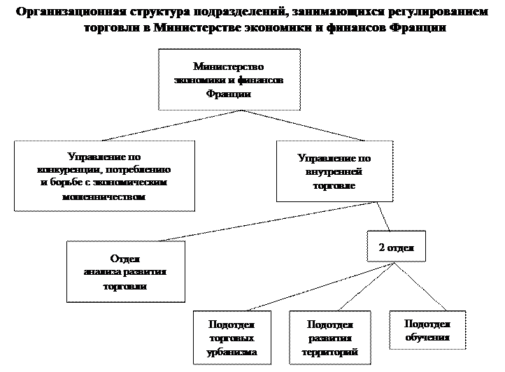 Министерство экономики и финансов осуществляет государственное регулирование по следующим направлениям: - защита потребителей; - контроль за ценами и наценками; - создание условий для развития конкуренции; - руководство развитием торговли. В структуре Министерства экономики и финансов Франции регулированием занимаются два управления: Генеральное управление по конкуренции, потреблению и борьбе с экономическим мошенничеством и Управление по внутренней торговле. Деятельность Управления по внутренней торговле нацелена на поддержание и стимулирование торговли в стране. Важнейшей задачей управления является создание благоприятных условий для образования новых торговых предприятий или передачи этих предприятий от одного хозяина к другому. Управление подразделяется на два отдела. Первый отдел занят анализом развития торговли, разработкой предложений по законодательству и налоговой политике применительно к внутренней торговле, а также распространением выпускаемых управлением многочисленных материалов. Второй отдел непосредственно вовлечен в экономические и социальные действия и состоит из трех подотделов: подотдел торгового урбанизма, подотдела развития территорий и подотдела обучения. Подотдел торгового управления координирует создание и расширение уже действующих крупных предприятий торговли. Подотдел развития территорий координирует работу по обеспечению торговыми услугами населения, проживающего на территории. Подотдел обучения координирует работу по обучению торговых работников навыкам коммерции. Генеральное управление по конкуренции, потреблению и борьбе с экономическим мошенничеством разрабатывает правила по защите прав потребителей, обеспечивает и контролирует соблюдение правил, обеспечивающих контроль за качеством продуктов.
