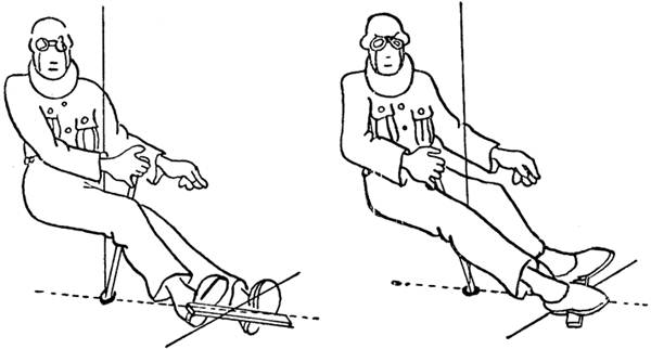 2. Для того чтобы хорошо чувствовать свой самолет, знать все его возможности и «склонности», необходимо испытать его на всех возможных скоростях. Только таким образом можно сделаться хозяином самолета и научиться диктовать ему свою волю; между тем, мы часто видим как раз обратное — летчик подчиняется «воле» своего самолета. Особенно полезно произвольно вызывать потерю скорости (на высоте, превышающей 600 м) и в это время испытывать органы управления, делающиеся вялыми и мало эффективными. Самый лучший способ избежать непроизвольной потери скорости и научиться удачно из нее выходить — это искусственно вызывать и изучать ее. 3. Надо приучить ученика сочетать (координировать) в должной мере действия органов управления самолета (рис. 1) и никогда их не перекрещивать, за исключением случая скольжения. Надо показать ему, что руль направления является наиболее ответственным органом управления, что наши ноги, вообще говоря, мало чувствительны, между тем как руки, гораздо более ловкие, имеют тенденцию всегда слишком сильно действовать ручкой. 4. Ученик, вылетая на сравнительно тихоходном самолете, тотчас же после взлета должен выдержать самолет некоторое время на горизонтальном полете и только после этого начинать