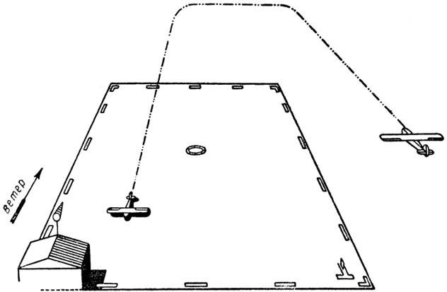 подъем. На самолете с небольшим диапазоном скоростей он точно так же должен сделать полет по прямой перед глубокими виражами, выполняемыми на высоте не менее 600 м (так как при перемене направления теряется скорость), в противном случае он будет «ковылять» при выходе из виража. 5. Он должен привыкать производить классическое планирование, завершающееся двумя разворотами под углом в 90°, так как это облегчает посадку (рис. 2). Это позволит ему в будущем уверенно и успешно совершать посадки на новых, незнакомых аэродромах или приземляться с остановившимся винтом. 6. Надо приучить ученика легко производить скольжение, так как иногда оно бывает очень полезно для исправления неверного расчета на посадку. Всякий раз, когда надо сократить траекторию самолета при его приземлении, инструктор должен заставить ученика сделать одно или два скольжения (при наличии запаса скорости, с полностью закрытым газом). Это приучит ученика самостоятельно делать небольшие скольжения во всех случаях, когда он будет видеть, что самолет может перетянуть через точку посадки; с другой стороны, это» придаст ученику уверенность в его силах, и он будет управлять самолетом, а не подчиняться ему. Скольжение является излишним на самолетах, снабженных закрылками. 7. И, наконец, мы настойчиво рекомендуем для усовершенствования практиковаться в планировании и посадках на точность с остановленным винтом. Благодаря этому летчик действительно в совершенстве ознакомится со своим самолетом, будет составлять с ним одно целое и приобретет нужную сноровку.