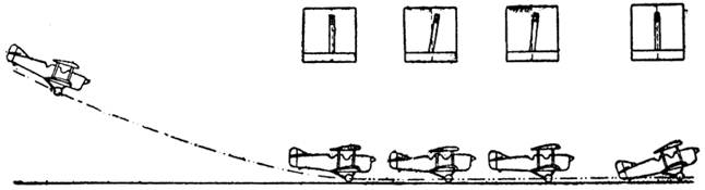 При вынужденной посадке на вспаханном поле или на поле, покрытом высокой травой, надо приземляться на минимальной скорости и параллельно бороздам, стремясь коснуться земли костылем раньше, чем колесами; в момент посадки ручку взять на себя доотказа. При сильном ветре следует делать посадку с высоко поднятым хвостом, держа самолет в линии полета; обороты мотора должны быть тем большими, чем сильнее ветер (рис. 12).
