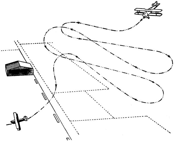 лишаемся возможности совершенствоваться в точности расчета посадки. Снижение «восьмеркой» дает то преимущество, что летчик почти все время имеет перед глазами аэродром и, при наличии известной привычки, легко может определить момент, когда он должен начать перед посадкой последний разворот под прямым углом. Спирали, спуски «змейкой» и «восьмеркой» запрещены на аэродромах с большим движением, а на других аэродромах разрешаются только в определенные часы, так как эти упражнения могут помешать посадкам других самолетов.