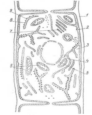Мал.10. Будова грибної клітини: 1 - клітинна оболонка, 2. - цитоплазматична мембрана, 3.- цитоплазма, 4.-ядро, 5.- ядерна оболонка, 6. - мітохондрії, 7.- комплекс Гольджі, 8. - ендоплазматична сітка, 9.- рибосоми.
