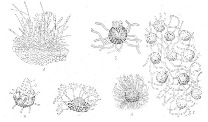 Мал. 14. Гриб мукор (Mucor mucedo). А - міцелій мукора; спорангії; Б, В, Г - розвиток спорангія; Д, Е і Ж - статевий процес і розвиток зиготи; З - зріла зигота її проростання. Завдання 5. Ознайомитись із плодосумчастими грибами на прикладі Борошнисторосяних. Борошниста роса злаків (Erysiphe graminis) паразитує на листках і стеблах пшениці, ячменю, вівса та інших. Спочатку листки вкриваються білим борошнистим нальотом, в якому помітні чорні крапки - клейстотеції. Спочатку розглядають гербарні зразки пшениці і вівса, уражені борошнистою росою. Після цього розглядають мікропрепарат борошнистої роси. На ньому видно міцелій з конідієносцями і ланцюжки конідіоспор (мал.15).