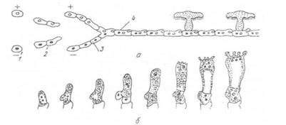 Статеве розмноження (мал.11) у нижчих грибів відбувається злиттям однакових або різних за розмірами рухливих гамет (ізо-, гетерогамія). При оогамії розвиваються жіночі (оогонії) і чоловічі (антеридії) статеві органи. У нижчих грибів статевий продукт (ооспора) проростає у спорангій з багатьма спорами в ньому. У зигоміцетів статевий процес здійснюється злиттям двох морфологічно однакових, а фізіологічно різних клітин, що формуються на кінцях міцелію. У сумчастих грибів статевий процес проходить у дещо відмінній формі гаметангіогамії. При заплідненні виріст антеридія стикається з жіночим статевим органом архікарпом і через трихігону переливає свій вміст в аскогон без диференціації на гамети. При ньому чоловічі та жіночі ядра зближаються попарно, але не зливаються, а утворюють пари ядер дикаріони, що синхронно діляться. Після запліднення з аскогона розвиваються аскогенні гіфи. На їхніх кінцях відособлюються верхівки гіф з дикаріоном. Ця клітина є материнською клітиною сумки (аска). В ній відбувається злиття ядер. Диплоїдне ядро ділиться тричі, виникає 8 гаплоїдних ядер, а навколо них ділянки цитоплазми. В сумці ендогенно формуються 8 аскоспор. Для базидійних грибів характерний статевий процес соматогамія злиття двох клітин вегетативного міцелію. Статевим продуктом є базидія, на якій утворюються 4 базидіоспори. Типи спороношення у грибів різні. Часто один і той же гриб може мати кілька спороношень: нестатеве(їх іноді кілька) і статеве. Наявнісь кількох типів спороношень у одного виду гриба називається плеоморфізмом. У процесі пристосування до умов життя утворилися різноманітні екологічні групи. Гриби відіграють велику роль у кругообігу речовин у природі, розклади решток тварин і рослин, утворення органічної речовини грунту, підвищенні його родючості. Досить великою є група грунтових сапрофітних грибів. Вони беруть участь у мінералізації органічної речовини, утворенні гумусу, руйнуванні лісової підстилки. Багато грибів з цієї групи утворюють мікоризу. Серед грунтових грибів є хижі гриби, що живуть як сапрофіти, але здатні уловлювати і живитись нематодами - дрібними круглими черв'яками. До грунтових грибів належать копрофіли, що живуть на грунтах, багатих на перегній, і кератинофіли - гриби, що живуть на волоссі, рогах і ратицях. Особливу групу утворюють ксилофіти - гриби, що розкладають деревину. Чітко виражену групу грибів утворюють паразити рослин і тварин. Існує специфічна екологічна група грибів, які розвиваються на різних промислових матеріалах, наприклад металі, виробах з нього (книги, рукописи тощо). Велика кількість грибів багата на ферменти. Вони утворюють ряд фізіологічно активних речовин (антибіотики, вітаміни, гібереліни) і органічних сполук (органічні кислоти, амінокислоти), отже, можуть бути джерелом для виробництва цих речовин у мікробіологічній промисловості. Деякі гриби - паразити комах та інших грибів - використовують як біологічний засіб боротьби із шкідниками і хворобами рослин. З грибів одержують препарати для знищення шкідливих комах (боверин) і грунтових патогенних грибів (триходермін). Шапкові їстівні гриби - цінний продукт харчування. Людина розводить і вирощує деякі види їстівних грибів у культурі (печериці, літній опеньок, вольваріела та ін.). Багато грибів є шкідливими. Гриби - паразити рослин з