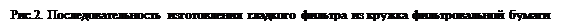 Бумажные фильтры изготавливают из специальных сортов бумаги разной плотности. По сравнению со стеклянными фильтрами они химически нестойки и легко разрушаются растворами кислот и щелочей, некоторых солей. В то же время бумажные фильтры дёшевы и легко изготавливаются в лабораторных условиях. Различают гладкие и складчатые бумажные фильтры. Гладкие фильтры используются тогда, когда целью фильтрования является выделение твёрдого вещества (осадка). Такой фильтр изготавливают из круга фильтровальной бумаги, диаметр которого примерно в раза больше диаметра воронки. Для этого бумажный круг складывают вчетверо (по пунктирам) и образовавшийся сегмент разворачивают в конус, одна половина которого состоит из одного, а вторая – из трёх слоёв бумаги (рис. 2).