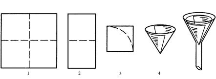 При отсутствии круга используют лист бумаги, имеющий форму квадрата со стороной, примерно в 2 раза большей диаметра воронки. Его складывают вчетверо, образовавшийся малый квадрат обрезают ножницами по дуге с таким расчётом, чтобы верхний край фильтра не доходил до края воронки на 3 – 5 мм. Как и в предыдущем случае, сегмент разворачивают в конус