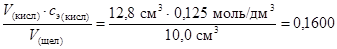 Это уравнение позволяет рассчитать значение эквивалентной концентрации вещества Х, если известно значение концентрации реагирующего с ним вещества Y. Данный тип расчетов очень широко используется в аналитической химии и лежит в основе метода объёмного анализа, основанного на измерении объёмов растворов реагирующих веществ. На практике для определения эквивалентной концентрации веществ используют метод титровáния (от франц. «titre» – количество). Он заключается в том, что к определённому объёму раствора с неизвестной эквивалентной концентрацией вещества Х постепенно добавляют раствор с известной концентрацией вещества Y до момента окончания реакции, которому соответствует изменение окраски индикатора. Определив таким образом точный объём добавленного раствора вещества Y, рассчитывают эквивалентную концентрацию вещества Х в исходном растворе. Пример 1. На титрование раствора гидроксида калия объемом 10,0 см3 израсходован раствор объемом 12,8 см3 с эквивалентной концентрацией серной кислоты, равной 0,1200 моль/дм3. Вычислить эквивалентную концентрацию щёлочи в исходном растворе. Решение: Из уравнения V (кисл) × с э(кисл) = V (щёл) × с э(щёл) выразим искомую концентрацию и найдем её значение: с э(щёл) = При приготовлении растворов с заданными значениями молярной концентрации эквивалентов необходимо помнить, что молярная масса эквивалента одного и того же вещества может иметь разные значения в зависимости от того, в какой реакции это вещество будет участвовать. Например, для реакции H2SO4 + NaOH ® NaHSO4 + H2O эквивалентом кислоты является её молекула и молярная масса эквивалентов равна 98 г/моль. В случае же другой реакции: H2SO4 + 2NaOH ® Na2SO4 + 2H2O эквивалентом кислоты является половина её молекулы и молярная масса эквивалентов в этом случае составляет: M Э к с п е р и м е н т а л ь н а я ч а с т ь