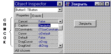 В левой части окна ИО приводятся названия всех свойств компонентов, которые доступны на этапе разработки приложения. Для каждого свойства справа содержится значение этого свойства. По умолчанию первая кнопка получает имя Button 1, вторая Button 2 и т.д. Разработчик может изменить свойство компонента, введя или выбрав нужное значение (название кнопки – Закрыть). Результат изменения свойств компонента становится сразу видимым в окне проектировщика форм. При изменении значения свойства Caption (Название) кнопки на поверхности ее появляется новое название.
