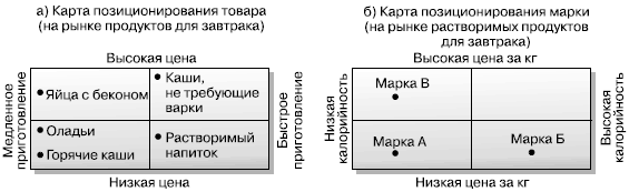 Рис. 10.3. Процесс принятия решений при разработке нового товара. Разработка концепций нового товара и их проверка Идея товара – это общее представление о продукте, который компания могла бы предложить рынку. Концепция товара – это проработанный вариант идеи, сформулированный в значимом для потребителя виде. Идею можно развить в несколько концепций товара. Во‑первых, кто будет пользоваться товаром? Во‑вторых, какими основными преимуществами должен обладать товар? В‑третьих, когда потребители будут использовать этот товар? Ответив на все эти вопросы, компания может предложить несколько концепций товара, выбрать наиболее перспективную и создать карту позиционирования товара. На рис. 10.4, а изображено позиционирование концепции товара, дешевого растворимого напитка для завтрака относительно других продуктов для завтрака, уже существующих на рынке. Эти контрастные сравнения могут быть использованы при ознакомлении потребителей с товаром и продвижении концепции на рынок.