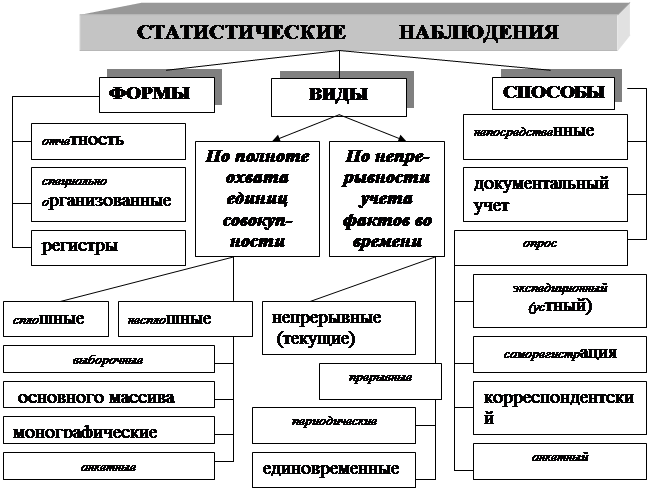Сплошное наблюдение - получение сведений о всех единицах изучаемой совокупности. Несплошное наблюдение проводят, когда физически невозможно, трудно или нецелесообразно осуществить сплошное наблюдение. Выборочное наблюдение - это такой вид несплошного наблюдения (обследования), при котором из всей изучаемой совокупности (называемой генеральной) чисто случайно (путём жеребьевки или другим способом) отбирается определенное число единиц (называемое выборочной совокупностью), для которых регистрируются все интересующие нас признаки и рассчитываются нужные в данном исследовании обобщающие показатели, после чего полученные выборочные характеристики распространяются на всю генеральную совокупность с определенной вероятностью. Метод моментных наблюдений, при котором информация собирается путем регистрации значений признаков у единиц выборочной совокупности в некоторые заранее определенные моменты времени. Иначе, данный метод предполагает проведение не только выборки в пространстве (отбор единиц совокупности), но и выборки во времени. Чаще всего этот вид наблюдения применяется при проведении обследований доходов населения. Анкетное наблюдение – это такое наблюдение, при котором заинтересованное в информации ведомство рассылает (или раздает) определенному кругу лиц особые анкеты, в которых заключены вопросы по всей программе наблюдения. Данный вид несплошного наблюдения недостаточно точный, т.к. заполнение и возврат анкет является делом добровольным. Кроме того, не на все вопросы могут быть даны ответы, либо не все ответы будут правильными. Обследование основного массива - наблюдение только единиц совокупности, которые по основному (для конкретного исследования) признаку имеют наибольший (доминирующий) удельный вес во всей совокупности, т.е. данный вид статистического наблюдения предполагает исследование наиболее крупных единиц изучаемой совокупности, а значит исключение из ее малозначимых единиц. Монографическое наблюдение представляет собой детальное, тщательное изучение (описание) одной какой-то единицы совокупности, причем она может представлять собой как действительно единичный случай, так и совокупность малых размеров. Такое наблюдение проводится с целью выявления имеющихся или намечающихся тенденций в развитии данного явления. Непрерывное (текущее) наблюдение предполагает регистрацию фактов изменения явления по мере их возникновения и проводится с целью изучения динамики данного явления. Периодическое наблюдение - сбор данных об объекте в ходе нескольких обследований, отстоящих друг от друга на определенный период времени. Как правило, такие наблюдения проводятся по однотипной программе с использованием единого инструментария. Единовременное обследование может проводиться по мере возникновения потребности в исследовании какого-либо явления (или процесса). Повторная регистрация либо вообще не проводится, либо осуществляется через какое-то (заранее неопределенное) время. Непосредственное наблюдение состоит в регистрации признаков интересующих нас явлений (или процессов) на основе непосредственного замера, взвешивания, подсчета и т.п. Документальный учет основан на использовании в качестве источника статистической информации различного рода документов, карточек, формуляров, листко