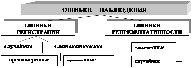 Рис.1.2. Виды ошибок наблюдений Ошибки регистрации могут возникать при любом статистическом наблюдении, они представляют собой отклонения между реальными данными и значениями показателей, полученных при статистическом наблюдении. Ошибки регистрации случайные возникают при случайном стечении обстоятельств, из-за невнимательности, халатности, недостаточной квалификации счетчика, несосредоточенности респондента и т.п. Они могут и завысить, и занизить показатель, а значит, в общей массе данных, они взаимно погашаются и не влияют существенно на результаты наблюдения. Ошибки регистрации систематические, как правило, имеют одну направленность (либо завысить, либо занизить показатель) и поэтому величина показателя по совокупности в целом будет включать в себя накопленную ошибку. В свою очередь, систематические ошибки регистрации разделяются на преднамеренные и неумышленные. Первые - следствие умышленного искажения фактов с определенной целью, а вторые могут возникнуть в связи с несовершенством программы наблюдения. Ошибки репрезентативности (представительности) характерны только для несплошного наблюдения и возникают именно в следствие несплошного характера регистрации. Различают тенденциозные и случайные ошибки репрезентативности. Первые возникают из-за неправильного, преднамеренного (тенденциозного) отбора единиц, т.е. когда отбираются заведомо лучшие или худшие единицы. Это приводит к нарушению основного принципа научно организованной выборки – принципа случайности. Случайные же ошибки репрезентативности являются обязательной характеристикой расхождения между показателями выборочной и генеральной совокупности и они могут быть измерены.