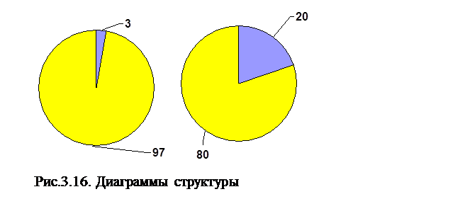 Решение Необходимо построить три круга одинакового радиуса. Для выделения секторов определить по приведенным данным центральные углы: для 1990г. центральный угол составит 10,8о (3 ∙ 3,6), для 1995г. – 61,8 о, для 2002г. - 144 о (рис.3.16).