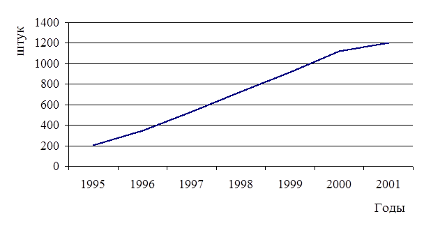 Задача 4. По данным о сборке легковых автомобилей (в шт.) за 1995 - 2001 гг. построить линейную диаграмму: 1995 1996 1997 1998 1999 2000 2001 201 344 529 730 917 1119 1201