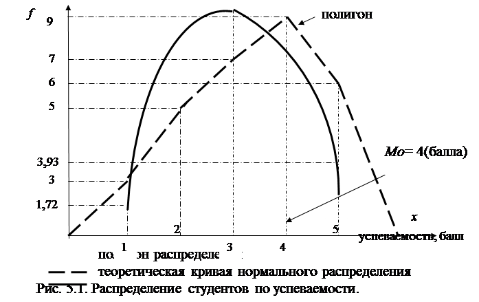 3. Cтруктурными средними выступают мода и медиана. Модальное значение признака, т.е. Мо = 4 (балла). Графически – это вершина полигона распределения (рис.5.1). Медиана равна 3 балла, так как SНАК = 3. Для оценки формы распределения исчислим коэффициент асимметрии и эксцесса: = 4(балла);