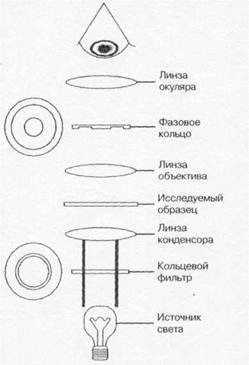 Фазово-контрастная микроскопия позволяет изучать живые и неокрашенные объекты за счёт повышения их контрастности. При прохождении света через окрашенные объекты происходит изменение амплитуды световой волны, а при прохождении через неокрашенные — фазы световой волны, что используют для получения высококонтрастного изображения в фазово-контрастной (рис. 1-3) и интерференционной микроскопии. Для повышения контрастности фазовые кольца покрывают металлом, поглощающим прямой свет, не влияя на сдвиг фазы. В оптической системе микроскопа применяют специальный конденсор с револьвером диафрагм и центрирующим устройством; объективы заменяют на иммерсионные объективы-апохроматы. Поляризационная микроскопия позволяет получать изображения неокрашенных анизотропных структур (например, коллагеновых волокон, миофибрилл или клеток микроорганизмов). Принцип метода основан на изучении объекта в свете, образованном двумя лучами, поляризованными во взаимно перпендикулярных плоскостях. Интерференционная микроскопия объединяет принципы фазово-контрастной и поляризационной микроскопии. Метод применяют для получения контрастного трёхмерного изображения неокрашенных объектов. Принцип метода основан на раздвоении светового потока в микроскопе; один луч проходит через объект, другой — мимо него. Оба луча соединяются в окуляре и интерферируют между собой. Люминесцентная микроскопия. Метод основан на способности некоторых веществ светиться при воздействии коротковолнового излучения. При этом испускаемые световые волны длиннее волны, вызывающей свечение. Иными словами, флюоресцирующие объекты поглощают свет одной длины волны и излучают в другой области спектра (рис. 1-4). Например, если индуцирующее излучение синее, то образующееся свечение может быть красным или жёлтым. Эти вещества (флюоресцеин изоцианат, акридиновый оранжевый, родамин и др.) используют как флюоресцирующие красители для наблюдения флюоресцирующих (люминесцирующих) объектов. В люминесцентном микроскопе свет от источника (ртутная лампа сверхвысокого давления) проходит через два фильтра. Первый (