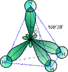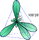 У результаті є вже не два, а чотири неспарених електрони. Оскільки ці чотири електрони різні (2s- і 2p-електрони), то повинні б бути різні й зв'язки в атома Карбону, однак доведено, що зв'язки в молекулі метану рівнозначні. Виявляється при “змішуванні” чотирьох орбіталей збудженого атома Карбону (однієї 2s- і трьох 2p-орбіталей) утворюються чотири рівноцінні sp3-гібридні орбіталі. Вони мають форму гантелі, одна з половин якої значно більше іншої. Внаслідок взаємного відштовхування sp3-гібридні орбіталі спрямовані в просторі до вершин тетраедра й кути між ними рівні 109°28' (найбільш вигідне розташування).
