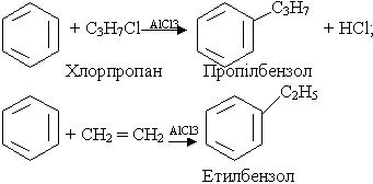 3. Алкілування. В молекулу бензолу замість водню можна ввести алкільний радикал. Процес алкілування можна здійснити дією на бензол галагенопохідної алкану чи олефіну при наявності каталізатора (хлорид алюмінію AlCl3):