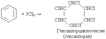 Під час інтенсивного опромінення реакційної системи світлом бензол може приєднувати хлор: