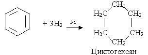 На відміну від наведених вище реакцій галогенування, в яких атом хлору чи брому заміщує водень в бензольному ядрі, в цій реакції атоми хлору приєднуються до всіх атомів вуглецю. В результаті руйнується p- електронна система бензолу і утворюється галагенопохідна циклоалкану 5. Гідрування. Одна з не багатьох реакцій приєднання, в яку може вступати бензол, - реакція гідрування при наявності платинових або нікелевих каталізаторів: