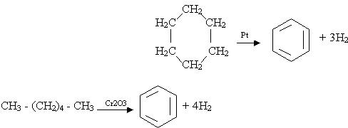 Добування. Бензол виділяють переважно з нафти та кам'яного вугілля при виробництві коксу. Бензол можна добути з циклогексану за реакцією дегідрування з участю платини як каталізатора або шляхом циклізації і дегідрування нормального гексану при наявності Cr2O3: