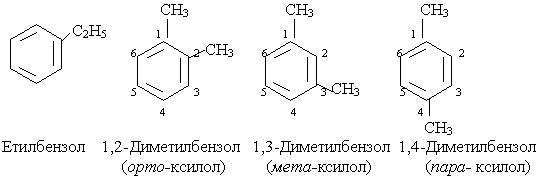 Як видно з наведених формул, гомологи бензолу, що мають у ядрі два однакових замісники, розрізняються розміщенням цих замісників один відносно одного, тобто є ізомерами. Назви гомологів бензолу складаються з назви замісника з додаванням кореня бензол, наприклад етилбензол. Якщо гомолог містить кілька замісників, то їхнє положення зазначають цифрами, що означають номери атомів вуглецю в бензольному ядрі біля яких знаходяться ці замісники, наприклад 1,2-диметилбензол. Нумерацію починають з одного з атомів вуглецю, біля якого є замісник. Для багатьох гомологів широко використовуються тривіальні назві (толуол, ксилол). Для позначення ізомерів з двома однаковими замісниками використовують префікси: орто-, мета-, пара-. В орто-ізомері замісники мають положення 1,2, в мета -ізомері - положення 1,3 і в пара -ізомері - положення 1,4. Ароматичні вуглеводні утворюють радикали, які є складовими частинами складніших сполук, наприклад: