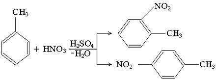 Загальна назва радикалів ароматичних вуглеводнів - арил. Властивості. Найпростіші гомологи бензолу за звичайних умов - це рідини з характерним запахом, вищі гомологи - тверді речовини. Для гомологів бензолу характерні ті самі реакції, що і для самого бензолу. 1. Нітрування, сульфування та алкілування. Ці реакції відбуваються як і для бензолу, за механізмом електрофільного заміщення. Особливість перебігу цих реакцій для гомологів бензолу виявляється в тому, що замісник, який є в ядрі, впливає на положення другого замісника. Звичайно при зміщенні водню в ядрі гомологів бензолу утворюється суміш орто-, мета- і пара -замісників, у якій переважають орто- і пара -сполуки. Наприклад, при нітруванні толуолу реакція йде таким шляхом: