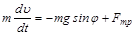 Представим основное уравнение динамики в проекциях на направление скорости и радиальное направление: