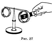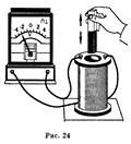 Для количественной характеристики процесса изменения магнитного поля через замкнутый контур вводится физическая величина под названием магнитный поток. Магнитным потоком через замкнутый контур площадью S называют физическую величину, равную произведению модуля вектора магнитной индукции В на площадь контура S и на косинус угла а между направлением вектора магнитной индукции и нормалью к площади контура. Ф = BS cos α (рис. 26). Опытным путем был установлен основной закон электромагнитной индукции: ЭДС индукции в замкнутом контуре равна по величине скорости из-менения магнитного потока через контур. ξ = ΔФ/t.. Если рассматривать катушку, содержащую п витков, то формула основного закона электромагнитной индукции будет выглядеть так: ξ = n ΔФ/t. Единица измерения магнитного потока Ф — вебер (Вб): 1В6 =1Β•c. Из основного закона ΔФ =ξ t следует смысл размерности: 1 вебер — это величина такого магнитного потока, который, уменьшаясь до нуля за одну секунду, через замкнутый контур наводит в нем ЭДС индукции 1 В. Классической демонстрацией основного закона электромагнитной индукции является первый опыт Фарадея: чем быстрее перемещать магнит через витки катушки, тем больше возникает индукционный ток в ней, а значит, и ЭДС индукции.