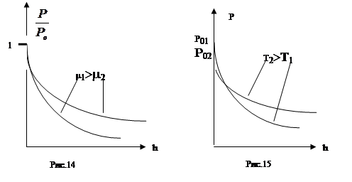 Последнее соотношение называется барометрической формулой. В действительности земная атмосфера не находится в равновесном состоянии, ее температура меняется с высотой, и барометрическую формулу следует применять к участкам атмосферы, в пределах которых изменением температуры можно пренебречь. Из барометрической формулы следует, что давление различных газов изменяется с высотой по-разному. На рис. 14 показано изменение давления газа с высотой для различных газов при T = const, а на рис. 15 – изменение давления газа (m = const) при разных температурах.