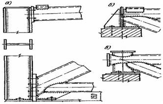 Укрупнительное соединение стропильных ферм в коньковом узле выполнять с центрирующей прокладкой между фланцевыми заглушками. Если нет станков для фигурной обработки торцов труб, узлы трубчатых ферм можно сплющивать (рис.9.22,б), а в исключительных случаях выполнять на фасонках (рис.9.22,в). Сплющивание концов допустимо лишь для труб из низкоуглеродистой или другой пластичной стали. Трубы одинакового диаметра соединяют встык на остающемся подкладном кольце (рис.9.23,а). При низком расчетном сопротивлении наплавленного металла стыковое соединение на подкладном кольце выполняют косым швом (рис.9.23б). Стыковое соединение можно также выполнить с помощью парных кольцевых накладок, гнутых из листа или вырезаемых из труб того же или несколько большего диаметра (рис.9.23,в). Толщину накладок и сварного шва рекомендуется принимать на 20% больше толщины стыкуемых труб. Стыкуемые соединения труб разных диаметров, работающих на сжатие, могут выполняться с помощью торцевых прокладок (рис.9.23,г). На монтаже часто применяются фланцевые соединения на болтах (рис.9.23,д). Решения опорных узлов приведены на рис.9.24.