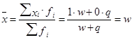 Дисперсия альтернативного признакаОбозначим через w долю единиц совокупности, обладающих альтернативным признаком, q – долю единиц, не обладающих этим признаком, то (w + q) = 1. Обозначим наличие признака у единиц совокупности цифрой 1, отсутствие признака – 0. Тогда средняя величина альтернативного признака будет определяться по формуле