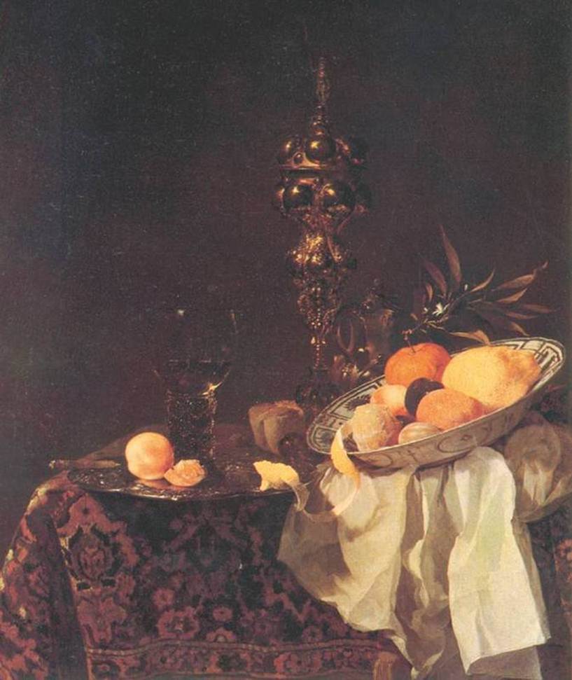 Среди других шедевров художественной коллекции Эрмитажа находится знаменитый «Натюрморт» Калфа. Это великолепное полотно, напоминающее лучшие картины Рембрандта, было создано зрелым художником. С помощью теплых красочных оттенков и тончайших светотеневых переходов Калф виртуозно моделирует предметы, поражающие зрителя своей убедительностью. Свет выхватывает из темноты покрытый узорным ковром столик, на котором расставлена изящная посуда. Красивое фаянсовое блюдо со свежими плодами, стоящее на смятой белой салфетке, нарочито небрежно сдвинуто вправо. Позади возвышается сверкающий позолоченный кубок. Оранжево‑желтые оттенки нежных фруктов гармонично сочетаются с прозрачным бокалом и коричневым орнаментом бархатной скатерти. Свет, отражающийся от блестящего кубка и стеклянного фужера, создает иллюзию реальности. Кажется, что, протянув руку, можно дотронуться до гладкой поверхности металлического кубка или ощутить тепло созревших на солнце плодов. Вертикальный формат, усиленный вытянутым вверх сосудом, делает композицию торжественной и нарядной. Подобно Рембрандту и Я. Вермеру, Калф умело сочетает теплые и холодные оттенки. Прекрасный дар колориста, тонкая наблюдательность, безупречный вкус позволяют живописцу почувствовать красоту окружающего мира и запечатлеть ее на холсте.