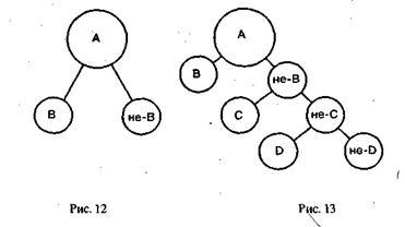 Деление должно быть непрерывным. Члены деления должны исключать друг друга. Это правило вытекает из предыдущего. Если выбрано не одно основание, то члены деления — видовые понятия — будут находиться в отношении частичного совпадения, как в приведенном выше примере. Подобный же результат получим при делении преступлений на умышленные, неосторожные и воинские. Деление всех студентов института на заочников, первокурсников и спортсменов также приведет к нарушению данного правила. В процессе деления родового понятия нужно переходить к ближайшим видам, не пропуская их. Например, понятие «преступление» можно разделить в соответствии с Уголовным кодексом Российской Федерации на преступления против личности, в сфере экономики, против общественной безопасности и общественного порядка, против военной службы и др. Каждый из этих видов в свою очередь может быть разделен на виды. Так, понятие «преступление против воинской службы» можно разделить на неисполнение приказа, сопротивление начальнику, самовольное оставление части или места службы, нарушение уставных правил караульной службы, утрата военного имущества и т.д. Но нельзя переходить от деления на виды одного порядка к делению на виды другого порядка, например делить преступления на преступления против личности, в сфере экономики, и утрату военного имущества. Такое деление лишено последовательности, оно называется скачком в делении. Дихотомическое деление, или дихотомия (от греческих слов dicha и tome — «сечение на две части»), представляет собой деление объема делимого понятия на два противоречащих понятия. Если А — делимое понятие, то членами деления будут два понятия: В и не-В. Например, все современные государства можно разделить на демократические и недемократические, всех граждан — на совершеннолетних и несовершеннолетних (рис. 12). Дихотомическое деление не всегда заканчивается установлением двух противоречащих понятий. Иногда отрицательное понятие вновь делится на два понятия, что помогает выделить из большого круга предметов группу предметов, интересующих нас в каком-либо отношении. В этом случае дихотомическое деление может быть представлено схемой (рис. 13).