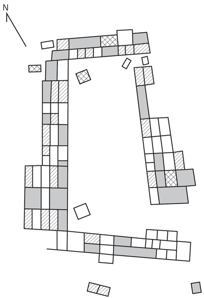 Рис. 3.5. Различные типы комнат в Броукен Кей Пуэбло. Закрашенные области представляют «большие комнаты»; заштрихованные – «маленькие», заштрихованные крестиком – «специальные комнаты. Пустые области не раскапывались. Джеймс Хилл выдвинул ряд проверяемых гипотез в отношении типов артефактов, которые могут быть найдены в разных комнатах