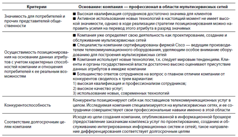 Этап 2. Выбор желаемой позиции Решение о выборе желаемой позиции принимается на основе привлекательности рыночных сегментов и сильных сторон компании в сфере обслуживания рыночного сегмента. На данном этапе необходимо определить, какими преимуществами в плане тех или иных атрибутов имиджа обладает компания. Нужно понять, по какому атрибуту или совокупности атрибутов будут дифференцировать компанию клиенты. Атрибуты имиджа и репутации, выбираемые в качестве основы для позиционирования, оцениваются по следующим критериям: ценность для клиентов и других представителей общественности; осуществимость позиционирования на основании этих атрибутов с учетом характерных способностей компании и отношения общественности к ее реальным возможностям; превосходство по данному параметру над конкурентами; соответствие долгосрочным целям компании. Для дифференцирования имиджа исследуемой компании мы можем использовать как уже значимые для общественности атрибуты, так и атрибуты, которые могут стать значимыми в результате воздействия на общественность. Было предложено два варианта дифференцирования. 1. Компания - профессионал в области мультисервисных сетей. В данном случае акцент сделан на профессионализме компании в узкой области телекоммуникаций. Для реализации позиционирования по данному основанию можно использовать атрибут «Высокая квалификация сотрудников», т.к. профессионализм компании определяют ее сотрудники, и атрибут «Активное использование новых технологий», т.к. при создании мультисервисных сетей используются передовые информационные технологии. 2. Компания - единый поставщик всех телекоммуникационных услуг. Акцент сделан на широте спектра предоставляемых услуг, заботе о клиентах, выражающейся в стремлении решить все проблемы, связанные с телекоммуникациями. Здесь можно использовать атрибуты «Внимательное отношение к клиентам» и «Высокая квалификация сотрудников», поскольку для оказания широкого спектра услуг требуются специалисты высокой квалификации. В результате сравнения предложенных оснований для дифференцирования был выбран первый вариант, т.к. он превосходил второй по двум критериям: осуществимости позиционирования и конкурентоспособности. На рис. 1 представлены аргументы в пользу данного решения. Оценка основания для дифференцирования по критериям